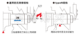 | 二、斯大走心機(jī)SR-32JtypeN采用高剛性的“主軸筒滑動(dòng)導(dǎo)向面構(gòu)造”無(wú)導(dǎo)套結(jié)構(gòu),在滑動(dòng)導(dǎo)向面上支持切削力,實(shí)現(xiàn)主軸臺(tái)的高剛性化. |