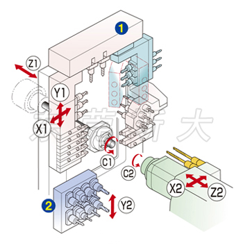 | 四、斯大走心機(jī)SR-20RIVtypeA了進(jìn)一步實(shí)現(xiàn)多樣化復(fù)合加工,充實(shí)了背面?zhèn)鹊墓δ,從而在背面刀架臺配備8軸鉆孔單元,并搭載Y2軸控制作為標(biāo)配,在刀架臺上備有可通過手動調(diào)節(jié)控制的角度型回轉(zhuǎn)動力單元,可使得刀具可在工件外圓和端面上加工帶角度的傾斜表面。 | |||